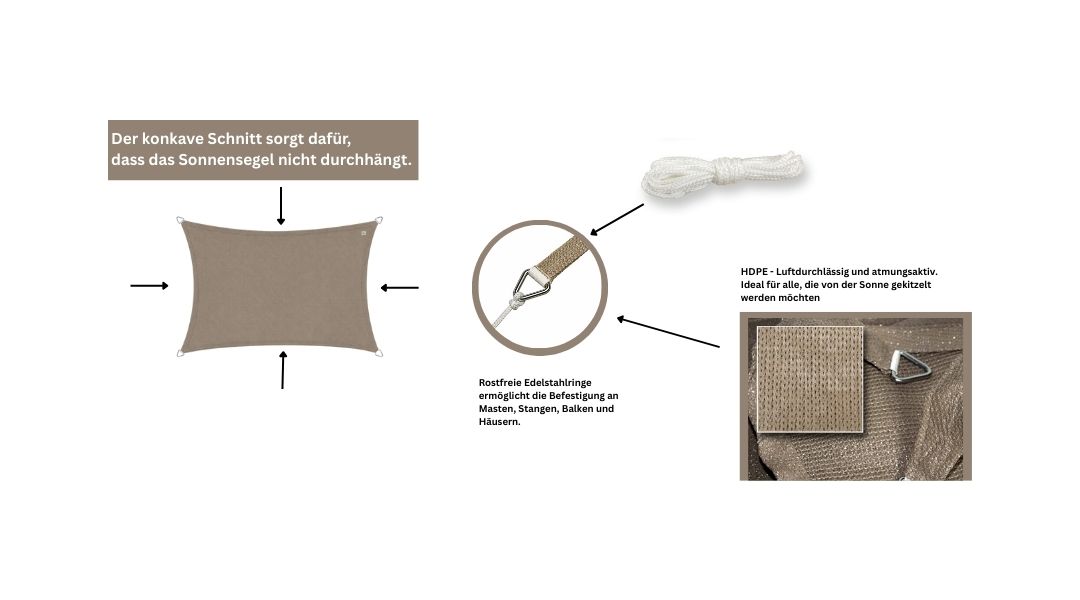 Größenangaben sind von Öse zu Öse. Wenn das Sonnensegel ordnungsgemäß gespannt wird, erreicht das Segel die angegebene Länge.