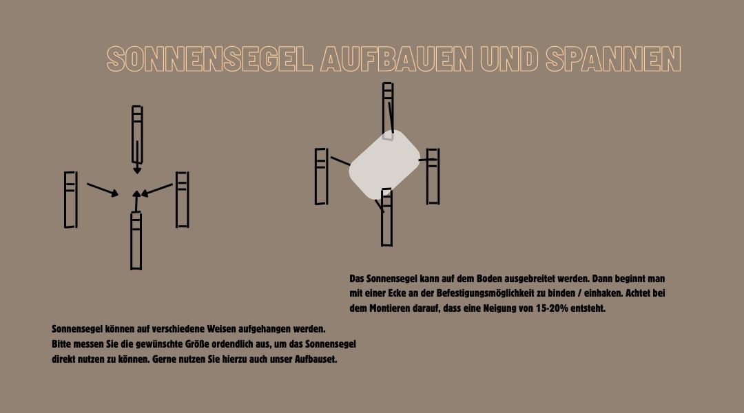 Damit eine lange Freude am Sonnensegel bleibt, empfehlen wir, dies bei heftigem Wind, Gewitter oder Sturm, sowie Schnee, abzuhängen.